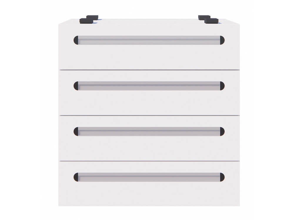 Hangende onderkast: de onderkast met 4 schuifladen kan onder de Interfurn tafels gehangen worden en is tevens vrij verschuifbaar onder de frames.