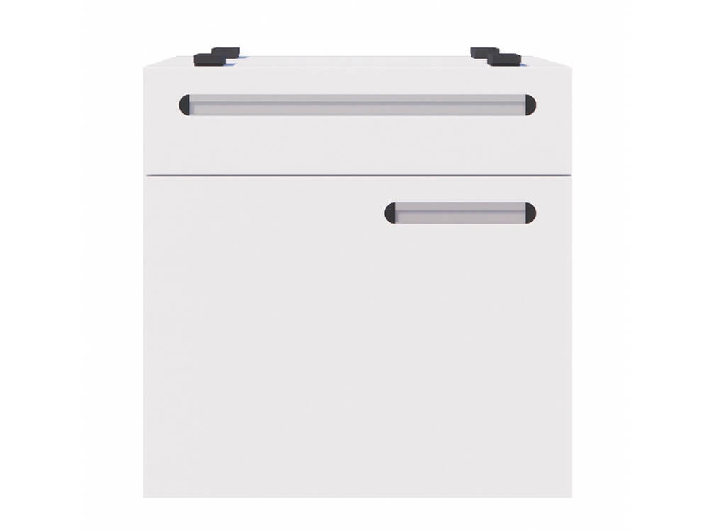 Hangende onderkast: de onderkast met 1 schuiflade en een draaideur waarachter een verstelbaar schap kan onder de Interfurn tafels gehangen worden en is tevens vrij verschuifbaar onder de frames.
