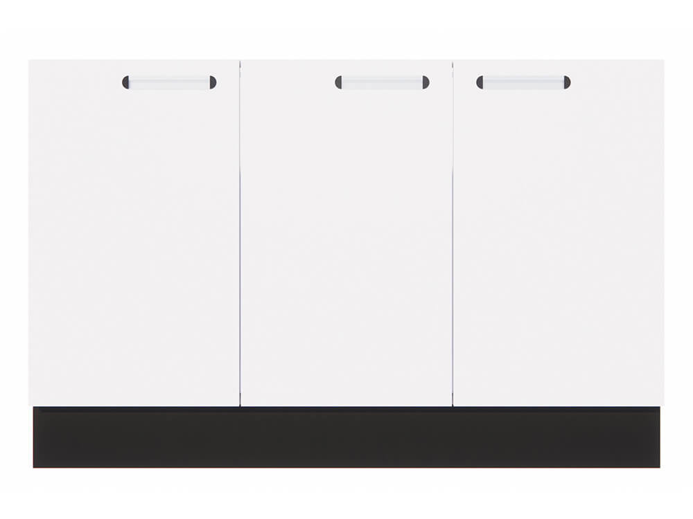 Spoelbak onderkast: een praktische onderkast met drie draaideuren. De kast wordt uitgevoerd zonder dek. Dit geeft mogelijkheid voor plaatsen van een blad met ingebouwde spoelbak. Het geheel kan gekit worden aan vloer. Neem contact op voor mogelijkheden.